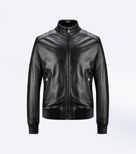Sleek Bomber Leather Jacket with Mandarin Collar